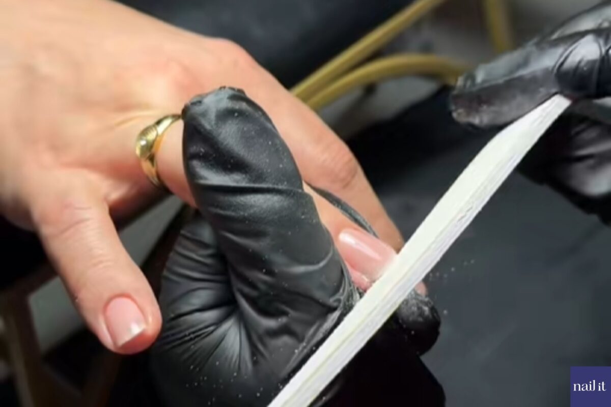 We start completely dry. I file your nails to your desired shape before anything else happens. Square, almond, oval, coffin, squoval. If you have a reference photo, this is when I want to see it.